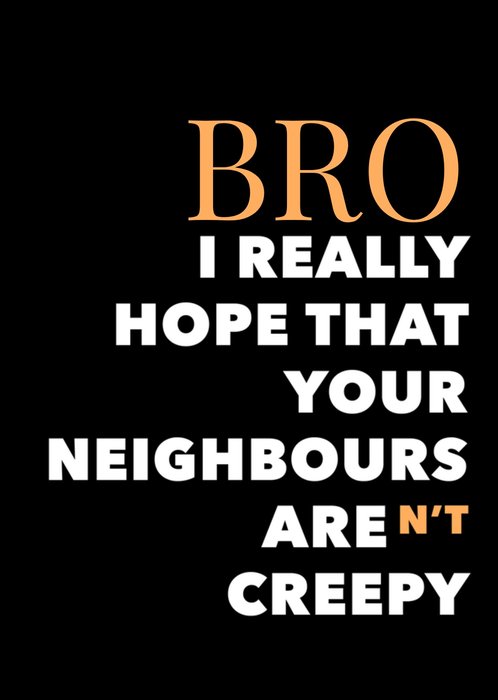 Jouw broer gaat een nieuwe en grote stap zetten, want! Hij gaat verhuizen. Stuur hem daarom een leuke verhuiskaart van Greetz! Op deze kaart staat: Bro, i really hope that your neighbours aren't creepy.