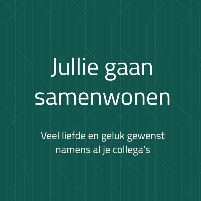 Gaat je collega, baas of zakenpartner in een nieuw huis wonen? Stuur hem of haar dan een leuke verhuiskaart van Greetz! Op deze kaart staat: Jullie gaan samenwonen. Veel liefde en geluk gewenst namens al je collega's.