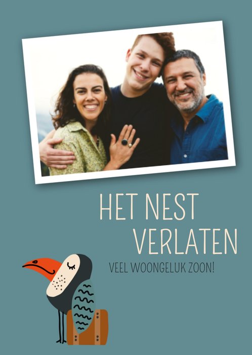 Wat zullen jullie trots zijn! Jullie zoon gaat verhuizen. Stuur hem daarom deze leuke verhuiskaart van Greetz. Op deze kaart staat: Het nest verlaten, veel woongeluk zoon. Ook kun je een foto toevoegen.