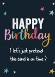Te laat met het sturen van een kaartje? Stuur dan deze leuke kaart van Greetz met de tekst: Happy Birthday (let's just pretend this card is on time).