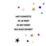 Kan de jarige een grapje wel waarderen? Stuur hem of haar dan deze grappige verjaardagskaart met de tekst: Met confetti in je reet is het feest bij elke scheet.