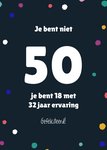 Op deze verjaardagskaart van Greetz staat de tekst: je bent niet 50, je bent 18 met 32 jaar ervaring. Gefeliciteerd!
