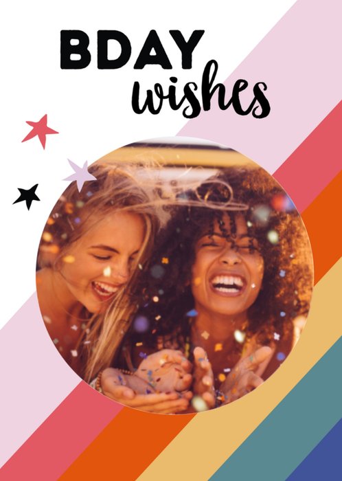 Wens de jarige een leuke verjaardag met deze vrolijke kaart met gekleurde strepen. Voeg een leuke foto toe om de kaart af te maken.