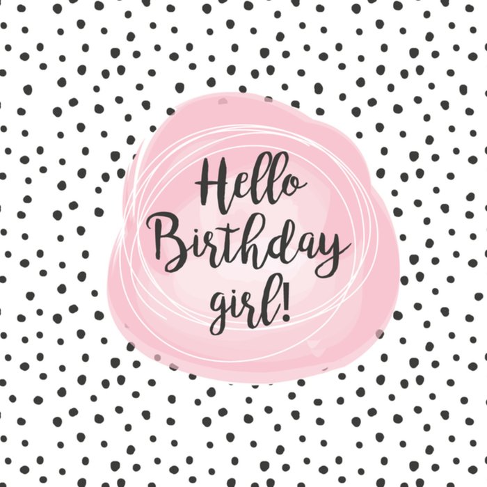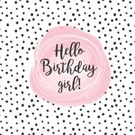 Een witte kaart met zwarte stippen. In het zwart staat op de kaart "Hello birthday girl!".
