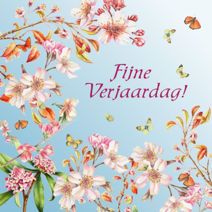 Blauwe, klassieke verjaardagskaart van Janneke Brinkman. Op de voorkant staan prachtige bloemen.