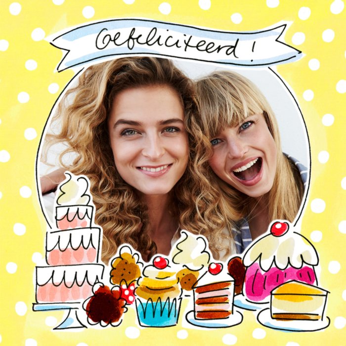 Een leuke verjaardagskaart waar je een foto aan kunt toevoegen. Ook zie je allemaal lekkere taartjes!
