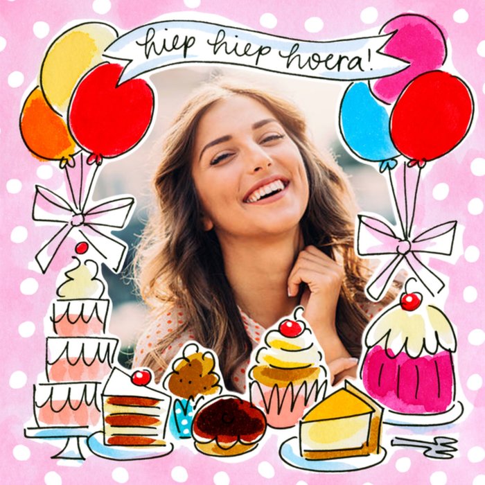 Een leuke verjaardagskaart waar je een foto aan kunt toevoegen. Ook zie je allemaal lekkere taartjes!