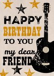 Wens een vriend een fijne verjaardag toe met deze verjaardagskaart met op de kaart een gitaar, sterren en de tekst: Happy birthday to you my dear friend.