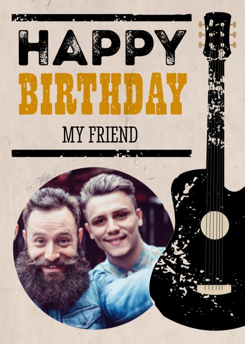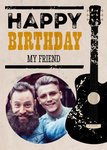 Wens een vriend een fijne verjaardag toe met deze verjaardagskaart met op de kaart een gitaar en de tekst: Happy birthday my friend. Voeg je eigen foto toe op de kaart.
