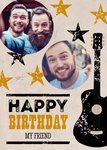Wens een vriend een fijne verjaardag toe met deze verjaardagskaart met op de kaart een gitaar, sterren en de tekst: Happy birthday my friend. Voeg twee eigen foto's toe op de kaart.