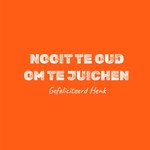 Op deze leuke verjaardagskaart staat: Nooit te oud om te juichen. Gefeliciteerd [naam].