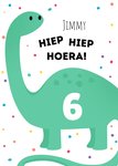 Een coole dinosaurus om de jarige te feliciteren. De naam is aanpasbaar en daaronder staat de tekst: 'hiep hiep hoera!'