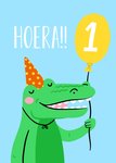 Er is er één jarig! En daarom moet er een leuke kaart opgestuurd worden! Op deze vrolijke verjaardagskaart staat een krokodil en Hoera! Ook kun je een leeftijd toevoegen.