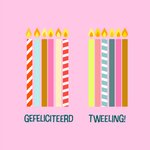 Hiep hiep hoera! Er is iemand jarig. Stuur deze vrolijke verjaardagskaart op om te feliciteren! Op de kaart zie je kaarsjes en de tekst: Gefeliciteerd tweeling.
