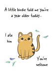 Stuur deze schattige kaart met een verjaardag. Op de kaart zie je een lieve kat en de tekst:'A little birdie told me you're a year older today. I ate him. You're welcome'.