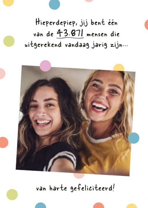 Op deze vrolijke kaart staat: Hieperdepiep, jij bent één van de 43.871 mensen die uitgerekend vandaag jarig zijn.. van harte gefeliciteerd. Ook kun je een foto toevoegen.