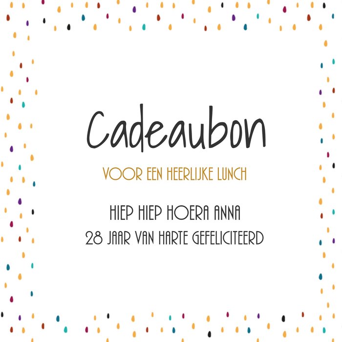 Op deze verjaardagskaart staat: Cadeaubon voor een heerlijke lunch. De tekst is aanpasbaar.