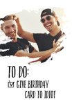 Vrolijke verjaardagskaart met foto en grappige tekst: "To do: checkbox: give birthday card to idiot"