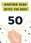 Alweer 50 jaar oud. Tijd om een leuke Abraham verjaardagskaart te sturen. Op de kaart zie je de tekst: Another year bites the dust. Onderaan zie je een vuist en 50 jaar.