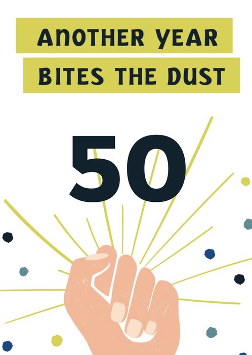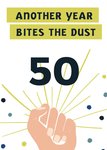 Alweer 50 jaar oud. Tijd om een leuke Abraham verjaardagskaart te sturen. Op de kaart zie je de tekst: Another year bites the dust. Onderaan zie je een vuist en 50 jaar.