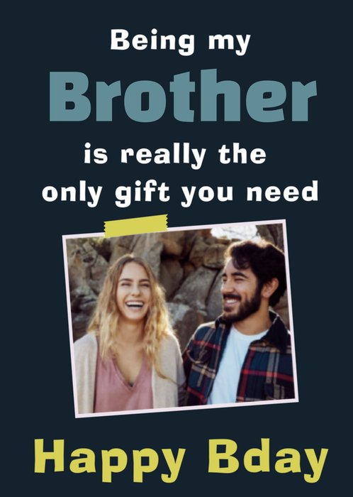 Is jouw grote of kleine broer jarig? Stuur ze dan een leuke verjaardagskaart met Greetz! Op deze kaart staat: Being my brother is really the only gift you need. Happy birthday. Ook kun je een foto toevoegen