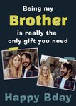Is jouw grote of kleine broer jarig? Stuur ze dan een leuke verjaardagskaart met Greetz! Op deze kaart staat: Being my brother is really the only gift you need. Happy birthday. Ook kun je twee foto's toevoegen.