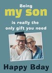 Wat leuk! Jullie zoon wordt binnenkort jarig. Stuur daarom een leuke verjaardagskaart speciaal ontworpen voor zonen, via Greetz. Op deze kaart staat: Being my son is really the only gift you need. Happy bday. Je kunt een foto toevoegen.