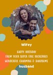 Op zoek naar een leuke humoristische verjaardagskaart? Ook zie je een prachtige taart en de tekst: Wifey happy birthday from your super fine incredibly wonderful charming & handsome husband.