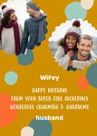 Op zoek naar een leuke humoristische verjaardagskaart? Ook zie je een prachtige taart en de tekst: Wifey happy birthday from your super fine incredibly wonderful charming & handsome husband.