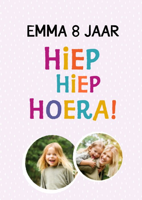 p deze leuke verjaardagskaart staat: Hiep hiep hoera! Ook kun je een naam, foto en leeftijd toevoegen.
