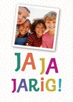 Op deze leuke verjaardagskaart staat: Ja, Ja Jarig. Ook kun je een foto toevoegen.