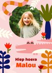 Er is er één jarig! Stuur deze leuke tropische kaart naar een meisje dat jarig is. Op de kaart staat: Hiep hoera. Ook kun je een naam en foto toevoegen.