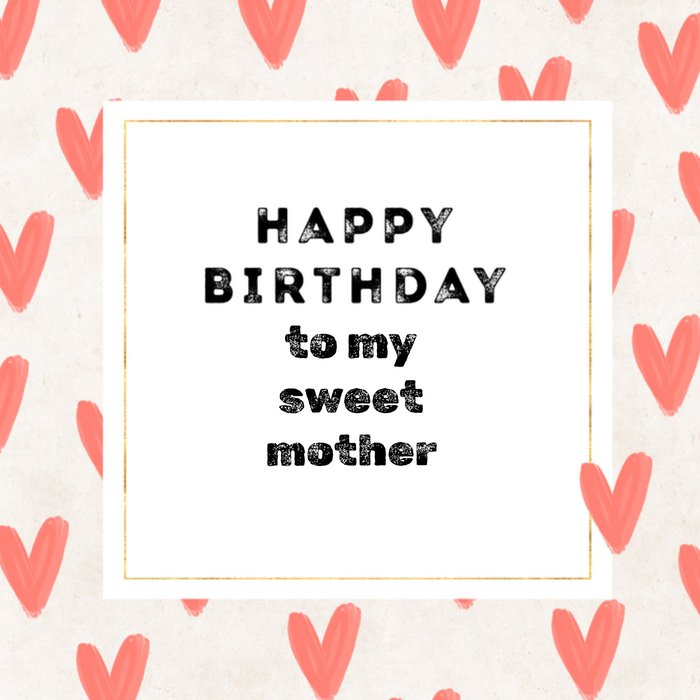 Wil jij je moeder goed verrassen met haar verjaardag? Doe dat dan met deze kaart gevuld met hartjes. Op de kaart staat de tekst: Happy birthday to my sweet mother.