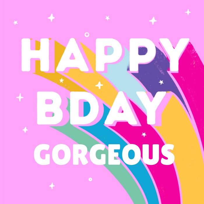 Wens iemand met deze kleurrijke kaart een fijne verjaardag toen. De kaart is roze met een regenboog met de tekst: Happy bday gorgeous.