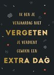 Op deze verjaardagskaart staat: Ik ben je verjaardag niet vergeten. Je verdient gewoon een extra dag.
