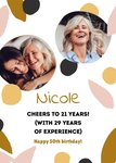Wens een Sarah een fijne 50ste verjaardag toe met deze grappige verjaardagskaart met de tekst: Nicole cheers to 21 years! (with 29 years of experience) Happy 50th birthday! De naam is aanpasbaar en je kunt foto's toevoegen.