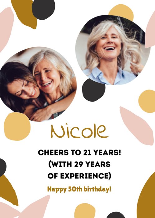 Wens een Sarah een fijne 50ste verjaardag toe met deze grappige verjaardagskaart met de tekst: Nicole cheers to 21 years! (with 29 years of experience) Happy 50th birthday! De naam is aanpasbaar en je kunt foto's toevoegen.