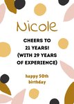 Wens een Sarah een fijne 50ste verjaardag toe met deze grappige verjaardagskaart met de tekst: Nicole cheers to 21 years! (with 29 years of experience) Happy 50th birthday! De naam is aanpasbaar.