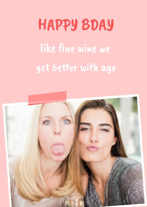 Wenskaart van Greetz ontworpen door Greetz designers, volgens de laatste trends. Voeg je eigen foto('s), tekst, & versiering toe om de kaart extra persoonlijk te maken. Je kunt de kaart toevoegen aan je favorieten of tussentijds opslaan om deze later af te maken. Toch liever een ander design? Bekijk alle verjaardagskaarten. Op deze lieve verjaardagskaart staat: Happy bday. Like fine wine we get better with age. Ook kun je een foto toevoegen.