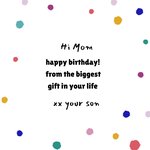 Op deze verjaardagskaart voor je moeder staat: Hi mom, Happy birthday! From the biggest gift in your life. xx Your son.
