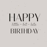 Op deze minimalistische verjaardagskaart staatL Happy little-bit-late birthday.