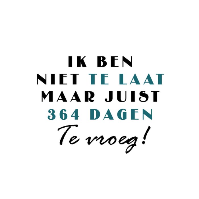 Grappige verjaardagskaart om iemand een fijne verjaardag me te wensen met de tekst: Ik ben niet te laat maar juist 364 dagen te vroeg!