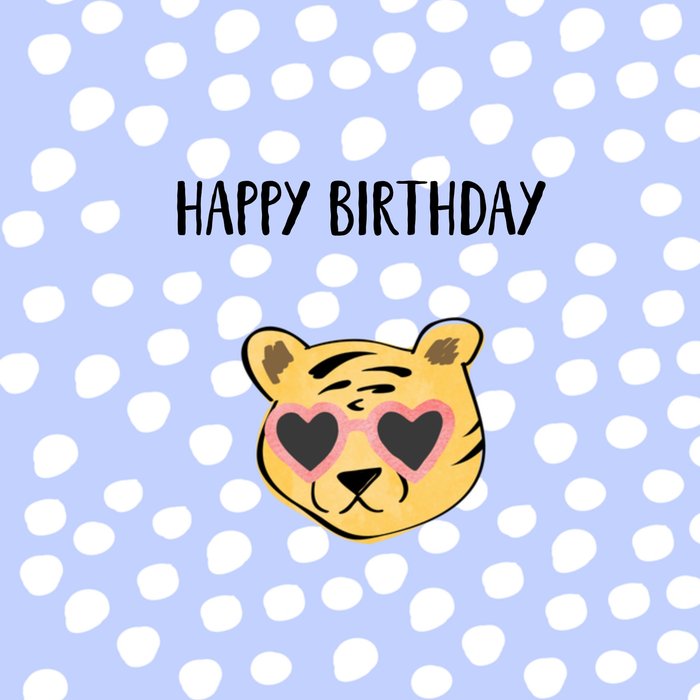 Op deze leuke verjaardagskaart met tijger staat: Happy birthday.