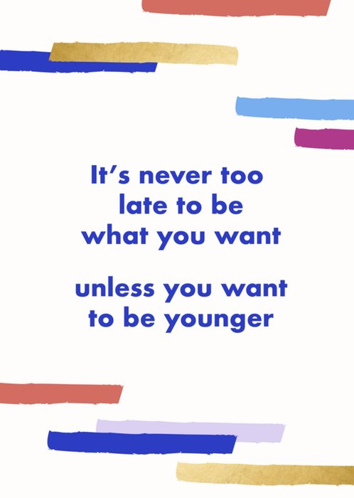 Grappige verjaardagskaart met grappige tekst. "It's never too late to be what you want - unless you want to be younger"