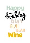 Vrolijke verjaardagskaart met grappige tekst: "Happy birthday blah blah blah wine".