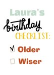 Vrolijke verjaardagskaart met naam en grappige tekst: "Birthday checklist: older (check) wiser (no)"