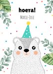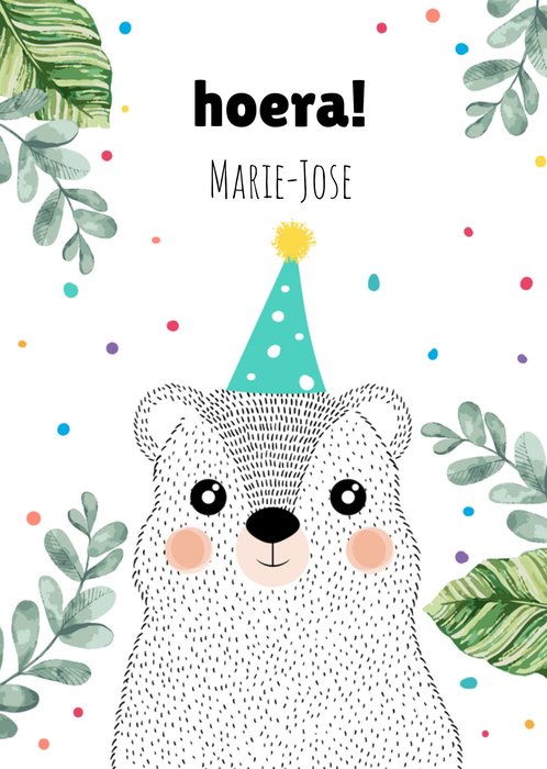Feliciteer de jarige met dit schattige kaartje met aanpasbare naam. De beer heeft zijn feestmuts al op.
