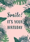 Een vrolijke verjaardagskaart met jungle bladeren en de tekst: Smile! It's your birthday.