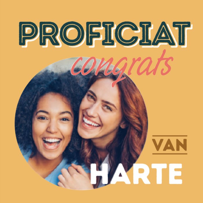 Feliciteren kan op veel manieren. Met dit kaartje bijvoorbeeld, in verschillende talen: Proficiat, congrats, van harte. Voeg een leuke foto toe van de jarige en de verjaardagsverrassing is compleet.