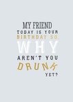 Wens een fijne verjaardag met deze leuke verjaardagskaart van Hotchpotch. Op de kaart staat de tekst: My friend today is your birthday so why aren't you drunk yet?